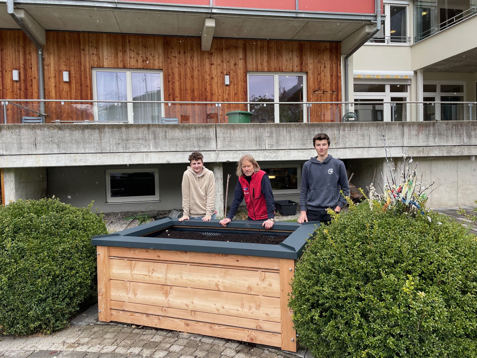 Die Schüler:innen durften dann im Zuge ihres Projektes unter der Anleitung von ihren Lehrer:innen Herr Viehhauser und Herr Ammerer das Hochbeet planen, in der Schule vorbereiten und schlussendlich bei uns im Garten aufbauen. Die Bewohner:innen schauten als Zaungäste mit großem Interesse dabei zu. Das Ergebnis lässt sich stolz präsentieren und die Bewohner:innen sowie Mitarbeiter:innen freuen sich auf frische Kräuter und Gemüse aus dem hauseigenen Beet!
