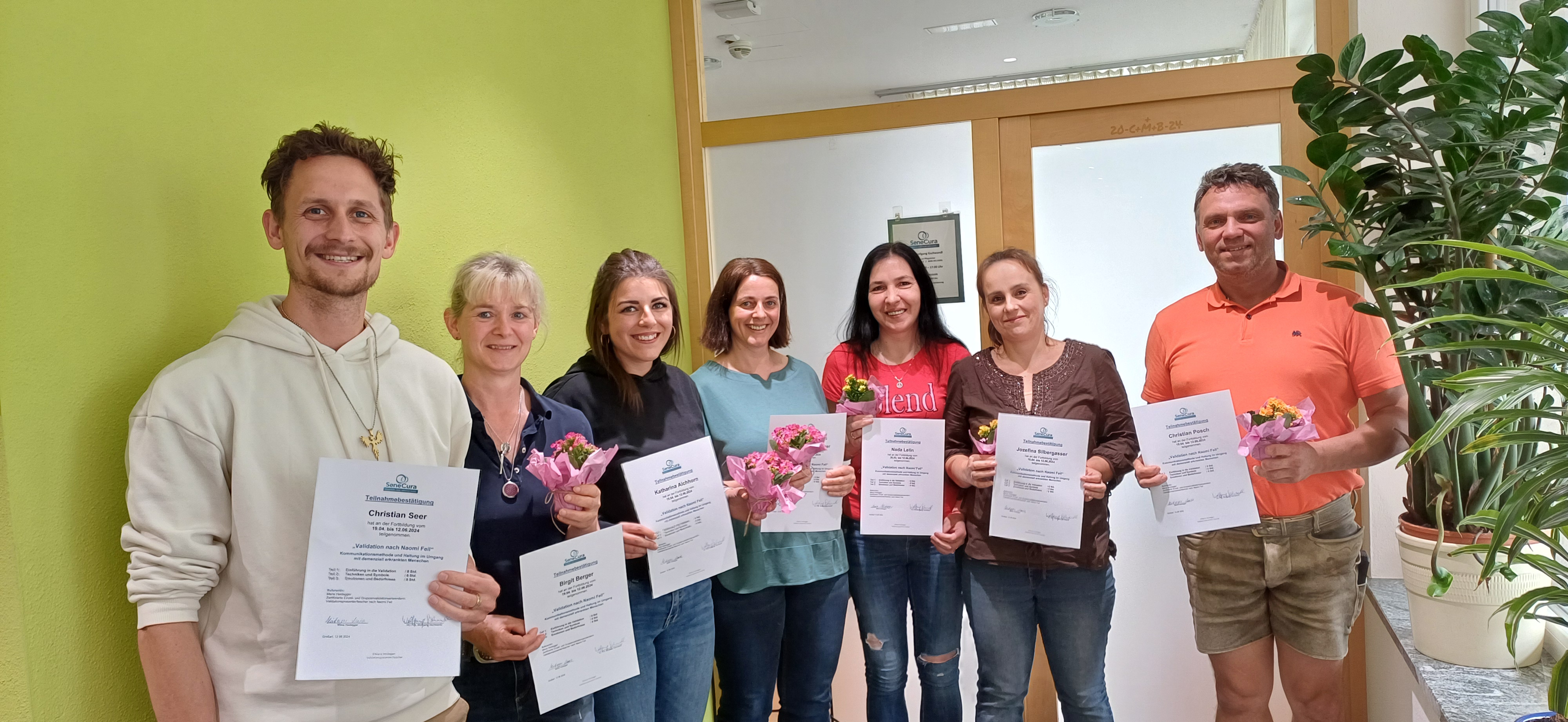 Im Juni wurden im SeneCura Sozialzentrum Großarl zwei Validationskurse erfolgreich abgeschlossen, welchen die Mitarbeiter:innen aus allen Abteilungen freiwillig und kostenlos besuchen konnten. Die Kurse zogen sich jeweils über mehrere Monate und ein Kurs bestand aus insgesamt drei Modulen. Die Trainerin überreichte mit dem Zertifikat auch ein kleines Blümchen, als Symbol dafür: „Auf dass die Validation in unserem Haus gut gedeihe!“