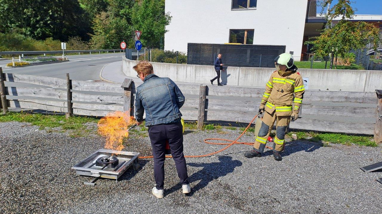 Sehr eindrücklich war die Demonstration des Fettbrandes, welcher mit einem Gläschen Wasser gelöscht wurde. Wenn man die Hitze der dadurch entstehenden Flamme am eigenen Leib spürt, bekommt man eine Ahnung, wie gefährlich dies ist und wie wichtig, im Ernstfall RICHTIG zu handeln. Hausleitung Wolfgang Gschwandl betonte auch, wie wichtig es ihm sei, dass die Mitarbeiter:innen auch zum Thema „Brandschutz“ immer bestens geschult sind, um die Gesundheit aller bestmöglich zu schützen.