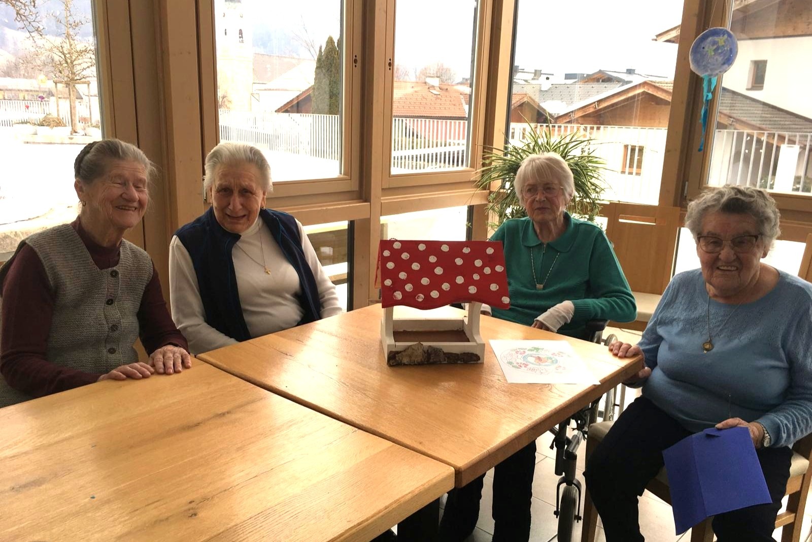 Auch die Vogelhäuser aus Wagrain und Hüttau zeugten von großer Kreativität und Gemeinschaftsgeist. Im SeneCura Sozialzentrum Wagrain entstand ein liebevoll gestaltetes Vogelhäuschen in echter Teamarbeit: Bewohner Anton Mühlbacher übernahm den Zusammenbau, während Sieglinde Pitter mit viel Sorgfalt den Anstrich gestaltete – ein kreativer Beitrag zur Natur und täglicher Blickfang für Bewohner:innen und Besucher:innen. In Hüttau wurde ebenso mit vereinten Kräften am Bau und der farbenfrohen Gestaltung des Vogelhauses gearbeitet. Traudi und Maria Althuber, Christine Lanner, Maria Heigl und Sigbert Deutschmann, Johann Breitfuß, Steffi Kaltenegger und Rupert Lackner sorgten für das bunte und fröhliche Design des Vogelhauses, voller Frühlingsstimmung.